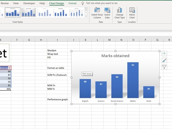 आप अपने चार्ट के स्टाइल्स भी बदल सकते हैं। इसके लिए आप क्लिक करें एक बार अपने चार्ट पर, आप देखेंगे एक टैब Chart design ribbon में दिखाई दे रहा होगा जिससे आप अपने चार्ट का डिज़ाइन बदल सकते हैं, देखे जैसे मैंने किया हैं यहाँ –
