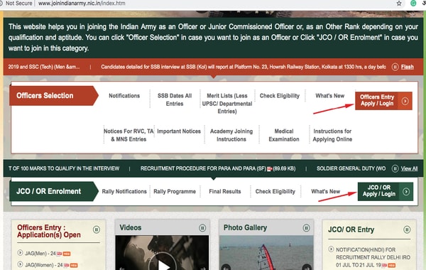 Step 3: Homepage khulane ke baad Officer post ke liye apply karne ke liye ‘Officer Entry Apply/Login‘ par click kare aur Soldier post ke liye apply karne ke liye ‘JCO/OR Apply/Login‘ par click kare