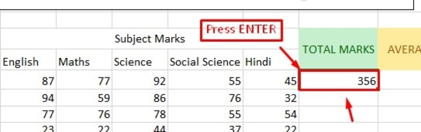Total marks nikalne ke liye aap jiss cell mein total marks nikalna chahte hain uss cell mein ye function lagaye –