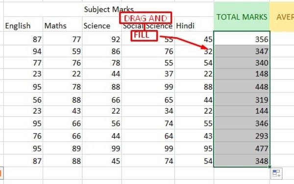 Baaki subjects mein bhi yahi apply karne ke liye apne cell ko select kare jismein aapne function lagaya hai aur usse right side drag karde aise-