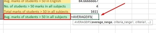 p. Avg. marks of students > 50 in all subjects | AVERAGEIFS function |